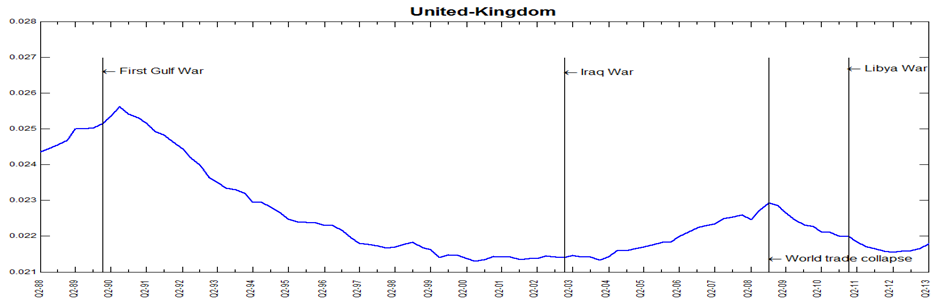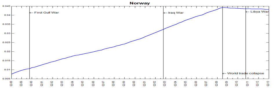 But, the most striking feature is the significant time variation in the contemporaneous responses of real exchange rates to oil price movements. More precisely, looking at Figure 1 we can identify at least two periods in the magnitude of real exchange rates' responses to an increase in the oil price. The first spans from the beginning of our sample period to the world trade collapse (2008) where the transmission of oil prices to real exchange rates clearly varies over time, significantly increasing and reaching a peak in some countries (Canada, Indonesia, Norway) or decreasing in the United Kingdom. This period coincides with the increase in the non-OECD’s oil consumption share in the world consumption, stemming mainly from a rise in China’s and India’s oil consumption. The second period begins after the world trade collapse, where the sensibility of real exchange rates is broadly maintained at a constant level. Differences in the adjustment pattern between those two periods and within each period underline the fact that the relationship between the oil price and real exchange rates is subject to change over time, suggesting that time-varying effects are a key issue when analyzing oil currencies. Moreover, as reactions of real exchange rates to the real oil price are more fluctuating during the first period which coincides with the increase in the non-OECD’s oil consumption, we should therefore expect to obtain more significant impulse responses when increases in oil prices are driven by a growing global demand. This confirms the relevance to investigate the origins of this time-varying dimension of the relationship between real exchange rates and the oil price, by distinguishing the underlying sources of oil price shocks.