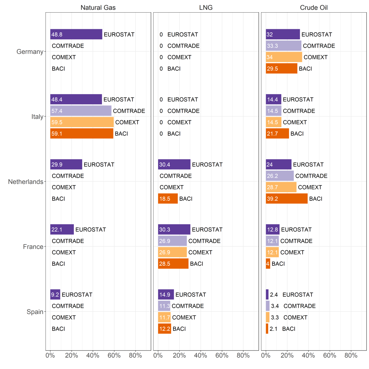 For natural gas, the shortcomings of trade databases persist, regardless of the indicator used. As far as the share of each European country in total EU gas imports is concerned, no trade database can consistently approximate the Eurostat figures (see Figure 2). For example, Comtrade overestimates Germany's share in total EU gas imports by a factor of 2, while Comext contains no information on German natural gas imports. BACI gives an apparently accurate German share, but this result is based on erroneous bilateral flows.