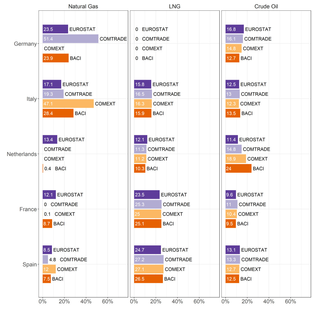 For four out of these five countries, neither Comtrade, nor Comext, nor BACI mention Russian natural gas imports in 2019, whereas Russia's market share actually ranges between 9% for Spain and 49% for Germany. Italy is the only country for which trade data report Russian natural gas imports, but Russia's share is overestimated by about 10 percentage points.