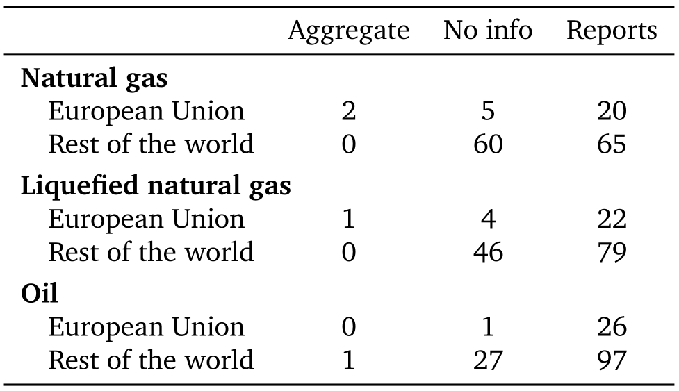 In fact, many countries do not declare flows of hydrocarbons. This happens for other goods, but at a much lower frequency. The phenomenon is particularly important for natural gas traded in gaseous form, but less acute for liquefied natural gas (LNG) and crude oil (Table 1). For example, in the main trade dataset (UN's Comtrade), 65 out of 152 countries report no imports of natural gas in gaseous form, including large European countries such as Finland and the Netherlands. Two other countries, Germany and Austria, only provide total imports without their geographical origin. Where a flow is not reported in the trade data, there is no way of knowing whether this is a genuine absence of a flow or a failure to report. One might hope to find information on imports from exporters' declarations. However, many major gas exporters, notably Russia, do not provide information on their sales either.