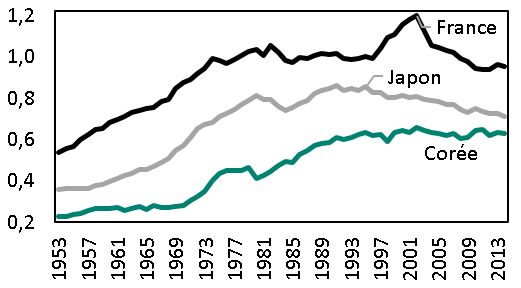 La croissance coréenne est passée d’un rythme annuel moyen de 11.8 % de 1963 à 1979, à 9.0 % de 1980 à 1997, puis à 3.7 % de 1998 à 2014 et enfin à moins de 3 % ces dernières années. En termes de niveau, les progrès de la productivité globale des facteurs, qui mesure le gain d’efficacité de l’économie, ont été considérables. Elle est passée de 23 % du niveau américain en 1953 à 63 % en 2014. Même si ce rattrapage est au point mort depuis 1995 par rapport aux États-Unis, il se poursuit par rapport au Japon et aux pays européens développés, comme la France. Enfin, compte tenu de longues heures de travail et d’un chômage faible, le niveau du PIB par tête coréen est proche en 2017 de celui de l’Italie.