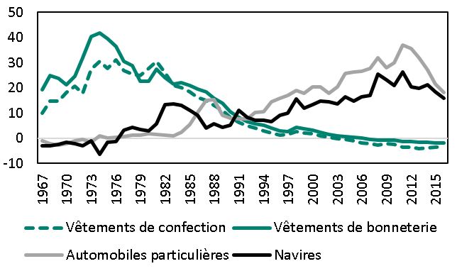 L’État coréen a mis en œuvre cette stratégie en concentrant ses moyens financiers sur quelques groupes industriels qui ont donné naissance aux grands conglomérats (chaebols); en guidant leur développement industriel, en définissant les priorités sectorielles, en favorisant une adaptation rapide des structures industrielles, en dessinant des cycles de spécialisation en perpétuel mouvement (cf. graphique 2). Ainsi les années soixante ont été dominées par les exportations des industries légères qui ont cessé d’être des industries importantes à l’exportation en 1991 pour la bonneterie, en 1992 pour la confection, en 1994 pour les objets en bois, en 1998 pour le cuir. Tandis que d’autres industries prenaient la relève : l’électronique grand public s’impose à partir de 1973 jusqu’en 1987 où elle est à son maximum puis décline ensuite du fait des délocalisations, les navires en 1977, à partir de 1984 l’automobile devient le moteur de l’exportation, les télécoms en 1986, l’informatique à partir de 1987, les objets en plastique en 1991, la chimie de base et les produits optiques en 2006, les composants électroniques en 2010, les fournitures électriques en 2012.