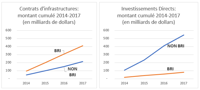 Selon le Mofcom, les investissements directs dans les pays participants au BRI sont très faibles, 18 milliards par rapport aux 138 milliards destinés aux pays hors BRI. Il y a relativement peu de rachat d’entreprises. Il y a plusieurs raisons à cela : les grandes entreprises de ces pays sont peu nombreuses, les données les concernant sont en général peu transparentes, de plus ces entreprises sont souvent protégées par leurs États. En revanche, la Chine propose à ces pays des prêts très importants et en forte croissance pour financer le développement de leurs infrastructures.