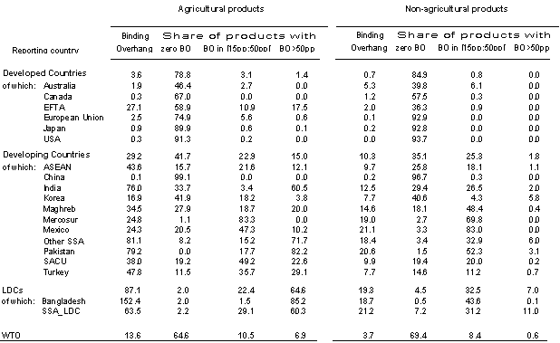 The orders of magnitude are different for developing countries. This is especially the case in agriculture for the poorest countries, namely the LDCs, India, Pakistan and the non-LDC sub-Saharan African countries, where the binding overhang exceeds 60 percentage points on average. This reflects the use of ceiling bindings in the Uruguay Round's tariffication. Although not reaching similar magnitudes for other developing countries, the binding overhang is high in agricultural products, generally exceeding 20% on average, and approaching 50% in ASEAN countries and Turkey. It is particularly significant that products with a binding overhang above 50 percentage points account for a significant share of reference group imports not only for the poorest countries, but also for ASEAN, Maghreb, Mexico, SACU and Turkey.
