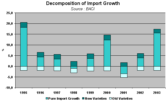 The main conclusion of this work is that, whereas the share of "pure" import growth always accounts for more than 90% of the total change in the imported value, the "extensive" margin may also be large. Indeed, the growth of imports due to new varieties is around 2% per year. On average, this is more or less compensated by disappearing varieties, but this is not true any longer at the country level. Moreover, this does not mean that changes in the array of imported varieties are neutral, as some old varieties may be replaced by new varieties that are cheaper, of better quality, etc.