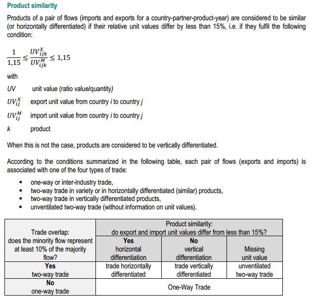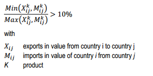 Trade at a country-partner-product-year level is considered to be two-way or intra-industry when the value of the minority flow (the smallest value between the export and import flows) represents at least 10% of the majority flow: