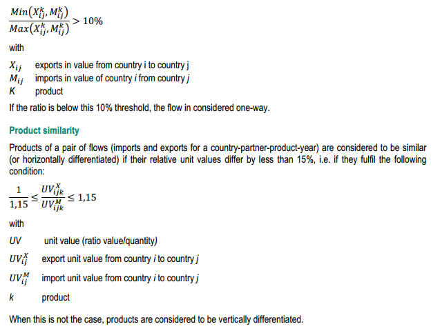 Trade at a country-partner-product-year level is considered to be two-way or intra-industry when the value of the minority flow (the smallest value between the export and import flows) represents at least 10% of the majority flow: