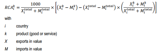 Trade balance of a product k is compared to a “theoretical balance” resulting from the distribution of the global balance observed between the various products in total trade of country i. This theoretical balance is, by construction, neutral towards any advantage or disadvantage of the country on the various products. So the distance between effective balance and theoretical balance on each of the products reveals the key or weak points of the country. The indicator is additive and the sum on all the products is equal to zero. To facilitate the comparisons between countries, the indicator is expressed in thousandths of the country's total trade.