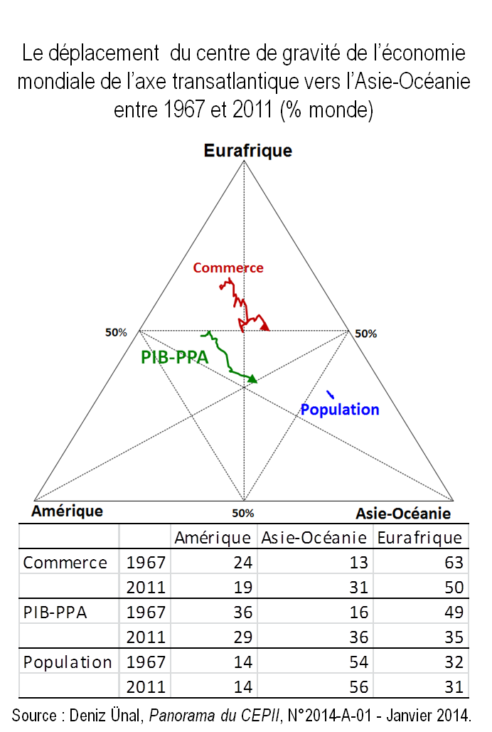 Graphique 1. Le déplacement du centre de gravité de l’économie mondiale de l’axe transatlantique vers l’Asie-Océanie entre 1967 et 2011
