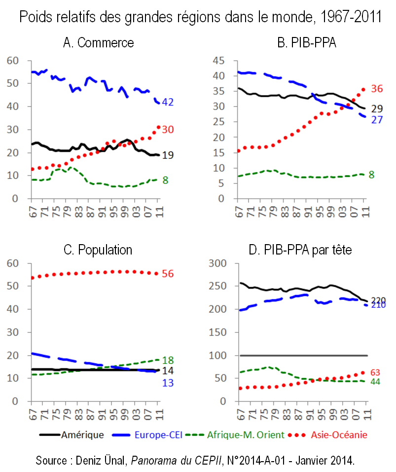 Graphiques 2. Evolution des poids relatifs des grandes régions (Amérique, Europe-CEI, Afrique-Moyen-Orient, Asie-Océanie) dans l’économie mondiale (population, commerce, PIB et PIB par tête) entre 1967 et 2011