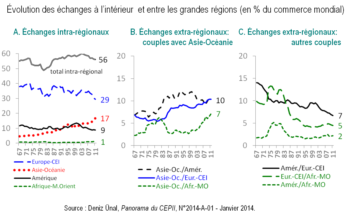 Graphiques 4. Évolution des échanges à l’intérieur et entre les grandes régions, 1967-2011 (en % du commerce mondial)