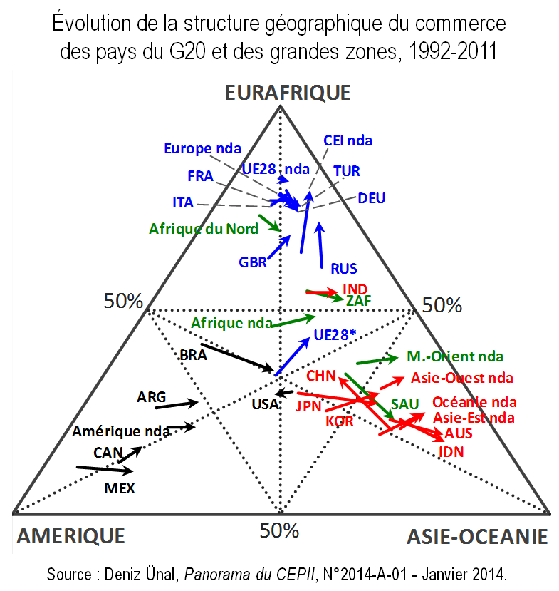 Graphique 6. Évolution de la structure géographique du commerce des pays du G20 et des grandes zones, 1992-2011