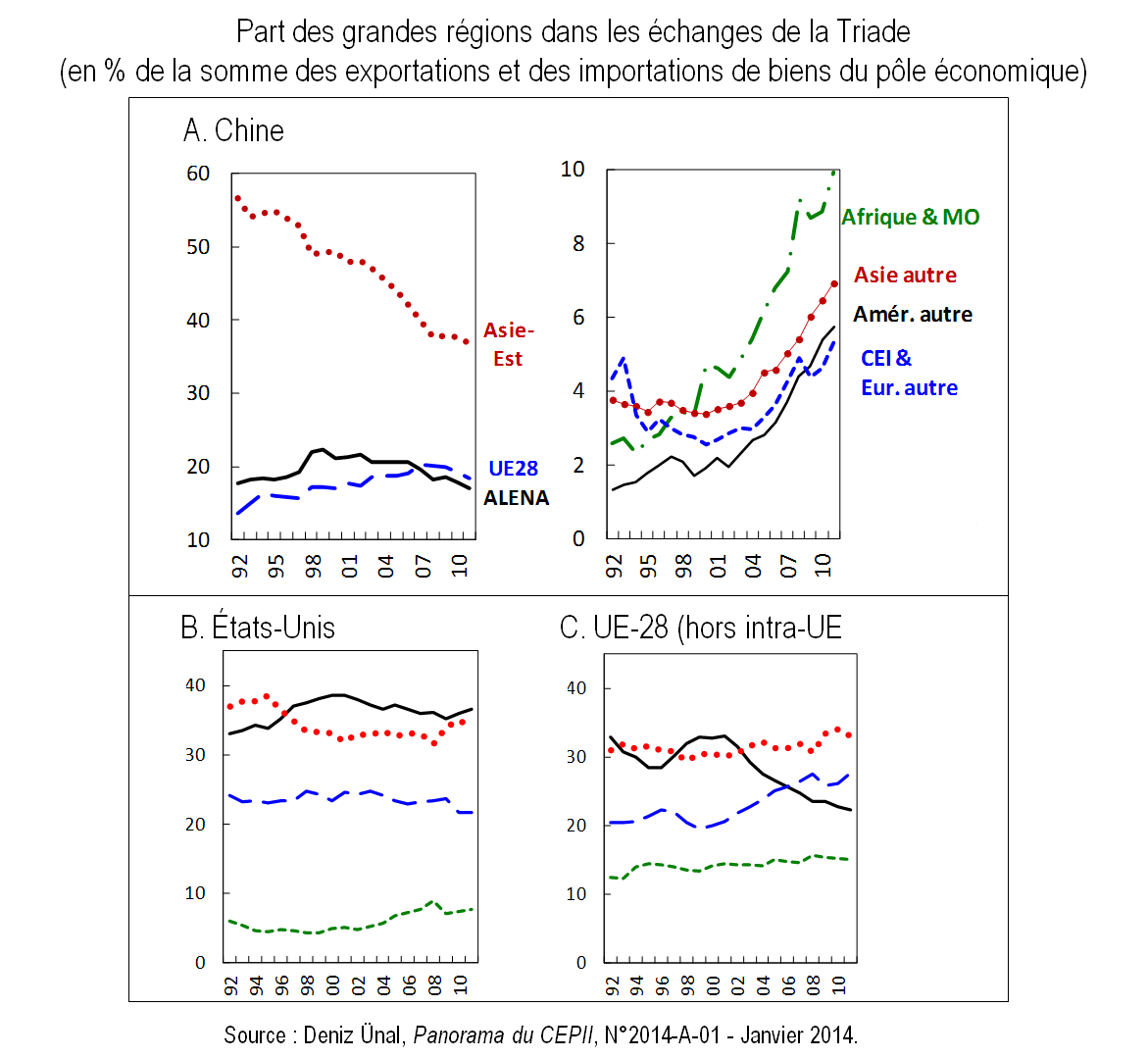 Graphiques 7. Part des grandes régions dans les échanges des Etats-Unis, de l’UE-28 et de la Chine (1992-2011)