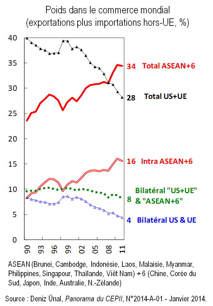 Graphique 8. Evolution du poids dans le commerce mondial du couple transatlantique et de l’ASEAN+6 (1990-2011)
