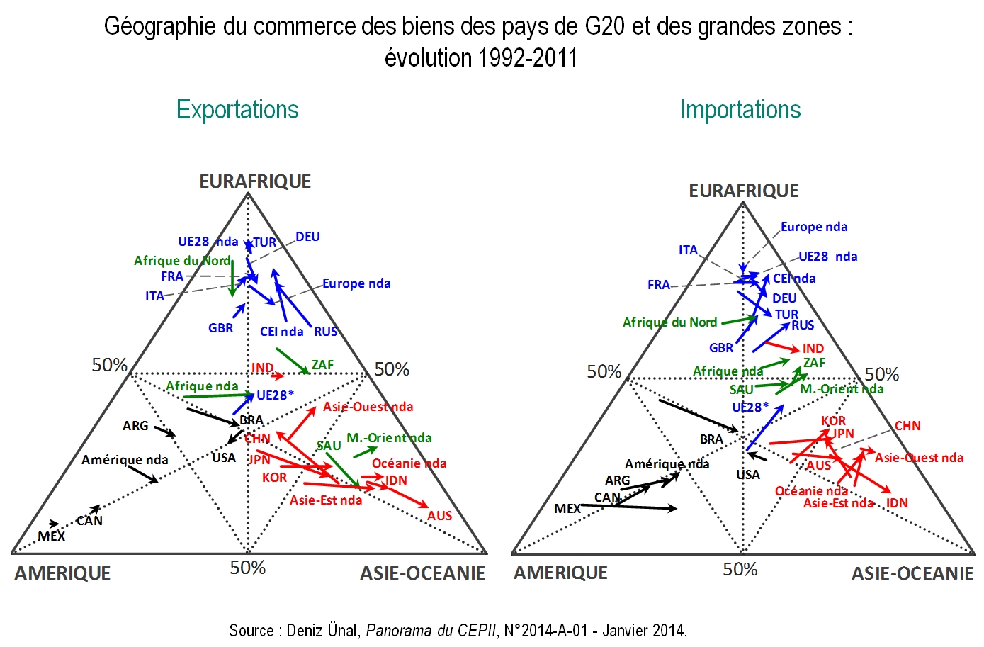 Graphiques A.1. Évolution de la structure géographique des exportations et des importations des pays du G20 et des grandes zones, 1992-2011