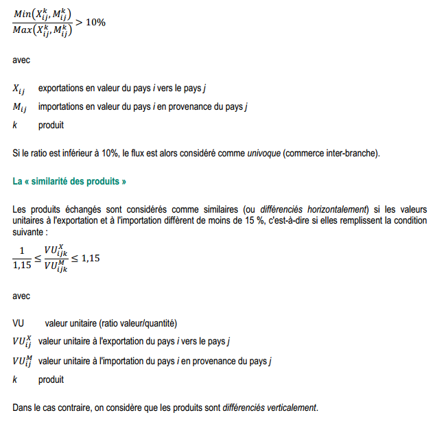 Dans le commerce international, deux partenaires peuvent à la fois exporter et importer les mêmes produits : ainsi, des producteurs français exportent vers l’Espagne des chemises pour hommes en coton et les producteurs espagnols exportent la même catégorie de produits vers la France. Il s’agit alors d’un recouvrement des échanges pour un même produit. Si le recouvrement dépasse un certain seuil, le commerce en question est qualifié de croisé, autrement dit, intra-branche.On considère ici que les échanges sont croisés lorsque la valeur du flux minoritaire (le montant des flux de l’un des partenaires inférieur à celui des flux dans le sens inverse) représente au moins 10 % du flux majoritaire :