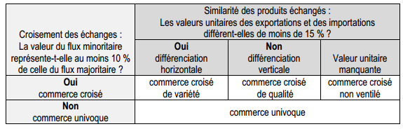 Selon les conditions récapitulées dans le tableau suivant, à chaque paire de flux (exportation/importation) est associé un des quatre types de commerce :